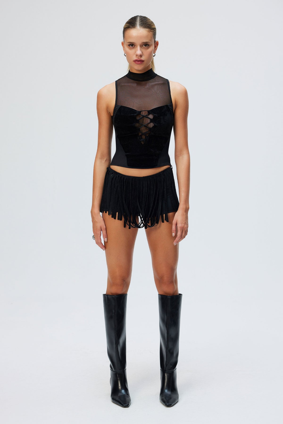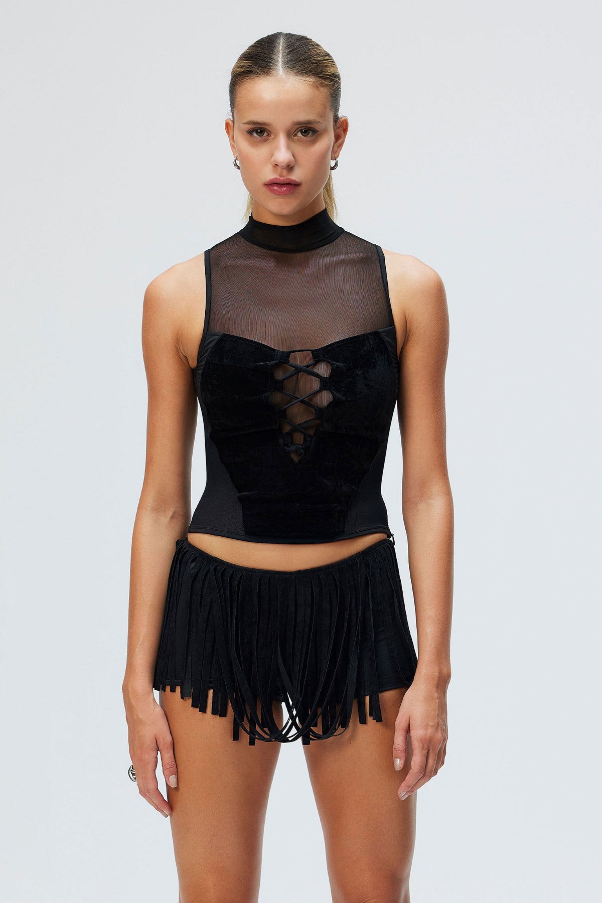 Sleeveless mesh top with corset-inspired front suede insert. Has a zipper on the left side.