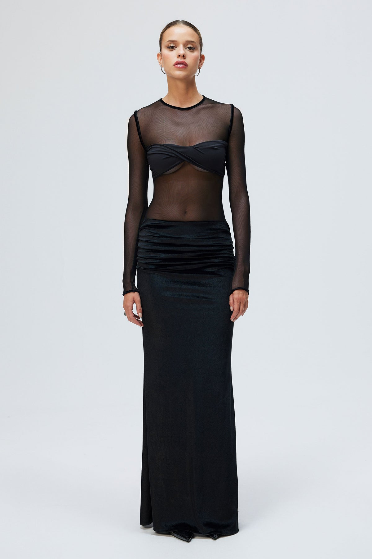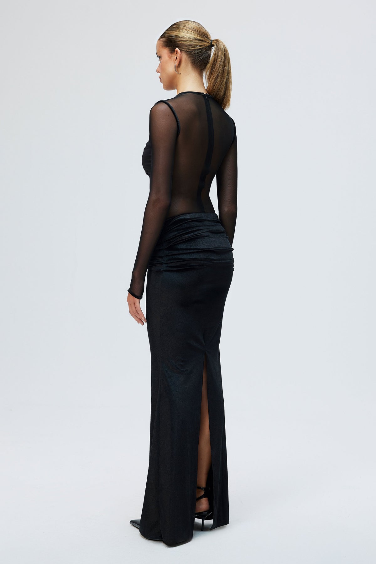 Maxi dress with a sheer tulle top, gathered bustier detail at the chest, and gathered, slit-detailed skirt in velvet fabric.